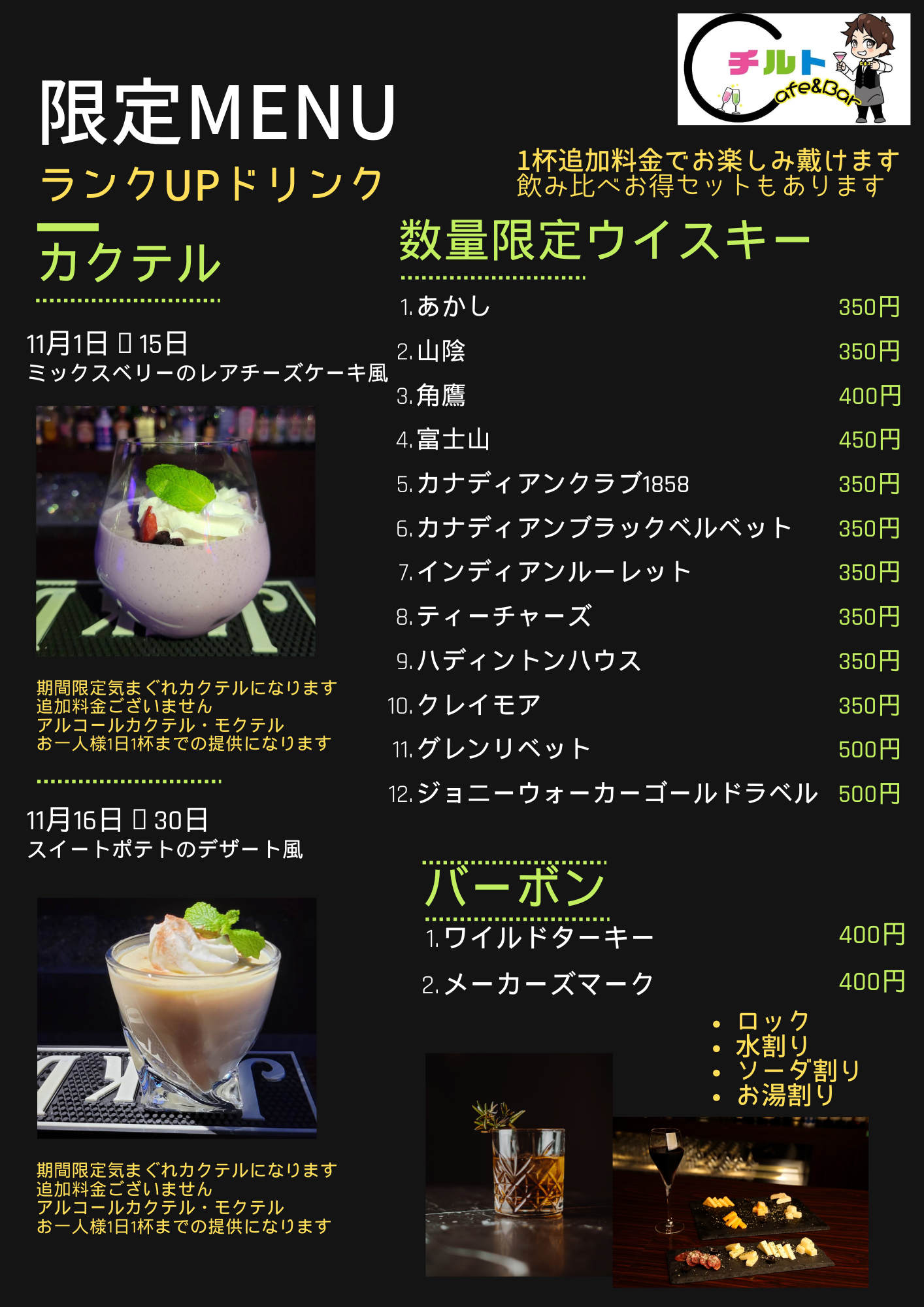 ※延長1時間+2,000円 Bar Time飲み放題ドリンクから注文可能になります
